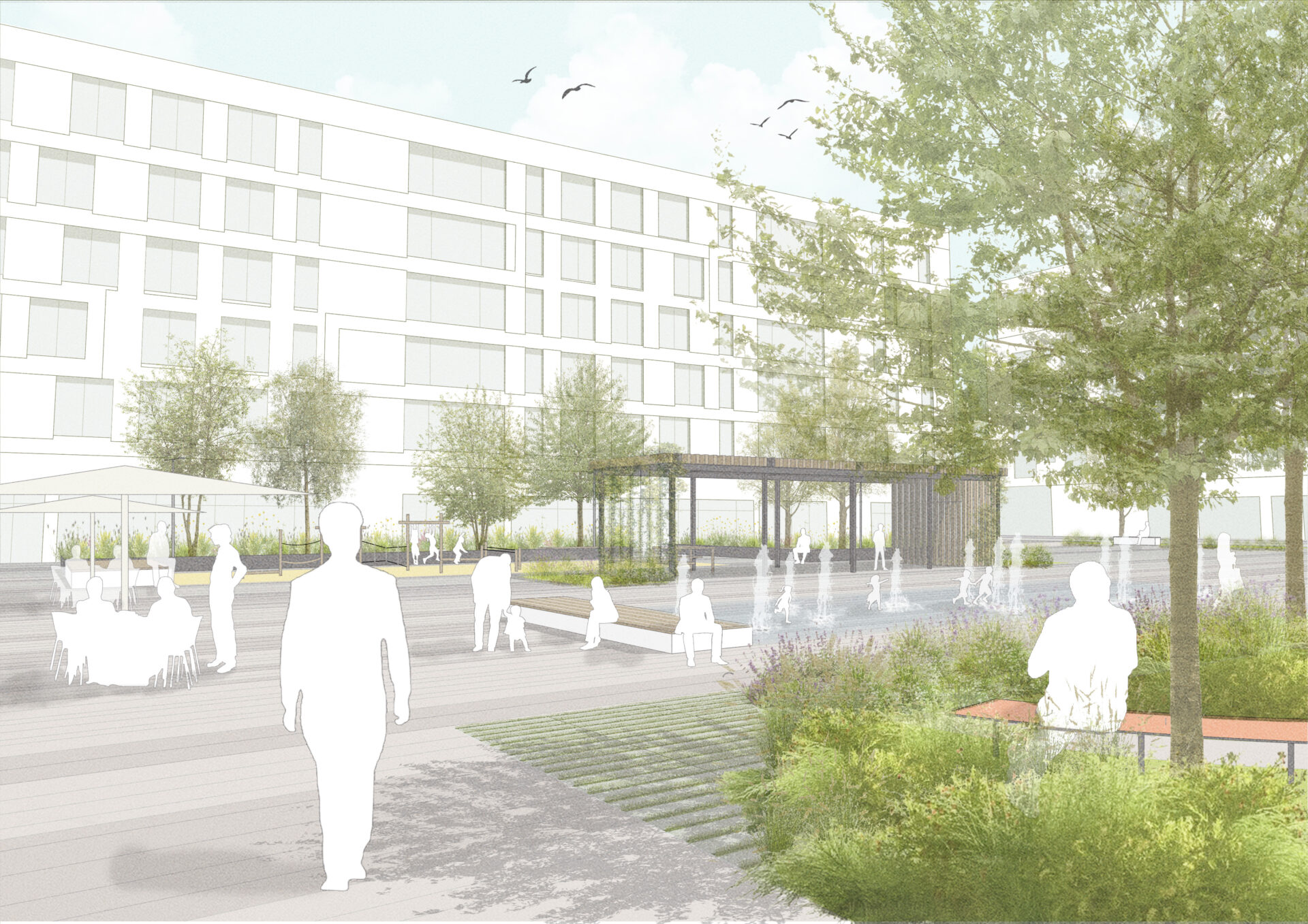Der Zweckverband Flugfeld plant den Platz 2026 teilweise zu entsiegeln. Zudem sollen Bäume, die aktuell auf dem Platz stehen und nicht richtig gewachsen sind, durch geeignetere Arten ersetzt und zusätzliche Bäume gepflanzt werden. Das beliebte Wasserspiel bleibt erhalten. Eine Pergola schafft zukünftig mehr Schatten und es kommen neue Sitzelemente dazu. Die Planung erfolgte gemeinsam mit den Fachämtern und dem ausführenden Büro Stefan Fromm Landschaftsarchitekten.